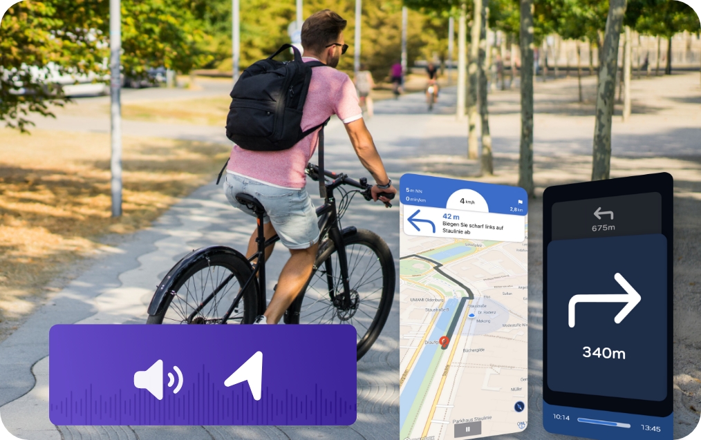 So hast du Deine Hände und deinen Kopf unterwegs immer frei. Dein Sprachassistent sagt Dir turn-by-turn an, wo es langgeht. Du kannst Dich ganz auf Deine Umgebung konzentrieren.